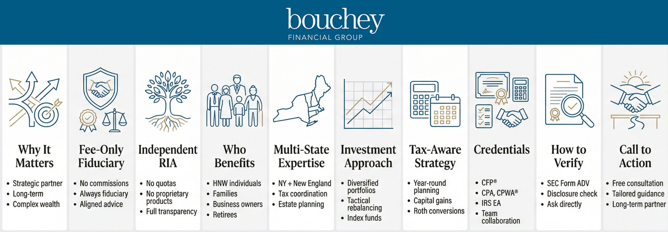 Bouchey Financial Group serves clients across 34 states, bringing experience with multi-state tax coordination, residency planning, and wealth transfer strategies that apply directly to the New York and New England region.