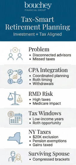 At Bouchey Financial Group, tax integration is built into the planning calendar — not bolted on at year-end. The process includes annual tax projections, mid-year bracket reviews, and year-end coordination sessions where withdrawal timing and conversion decisions are finalized with both tax and investment outcomes in mind.